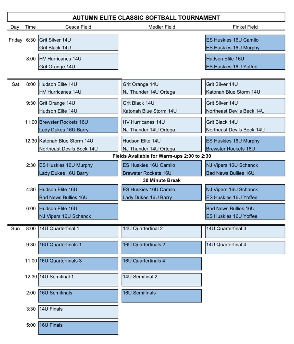 Please check in at least 45 minutes before your first game at the check in table by the Concession Stand. Please submit insurance and rosters, including any guest players via email. Insurance certificates should list the following as additionally insured: